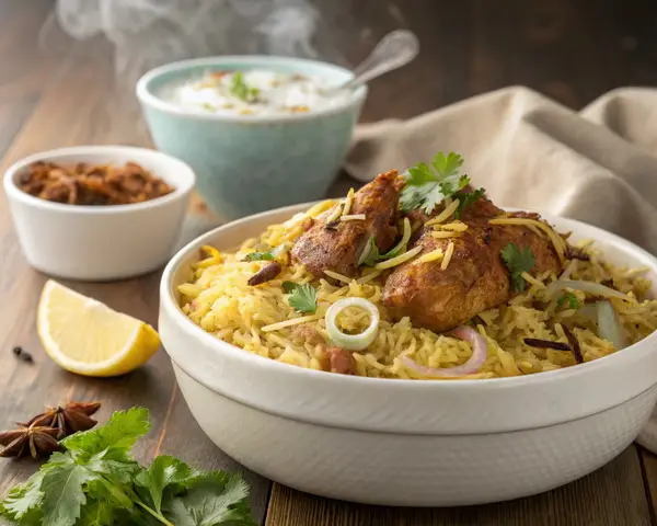 Aromatic basmati rice cooked with tender chicken, traditional spices, caramelized onions with fresh salad.